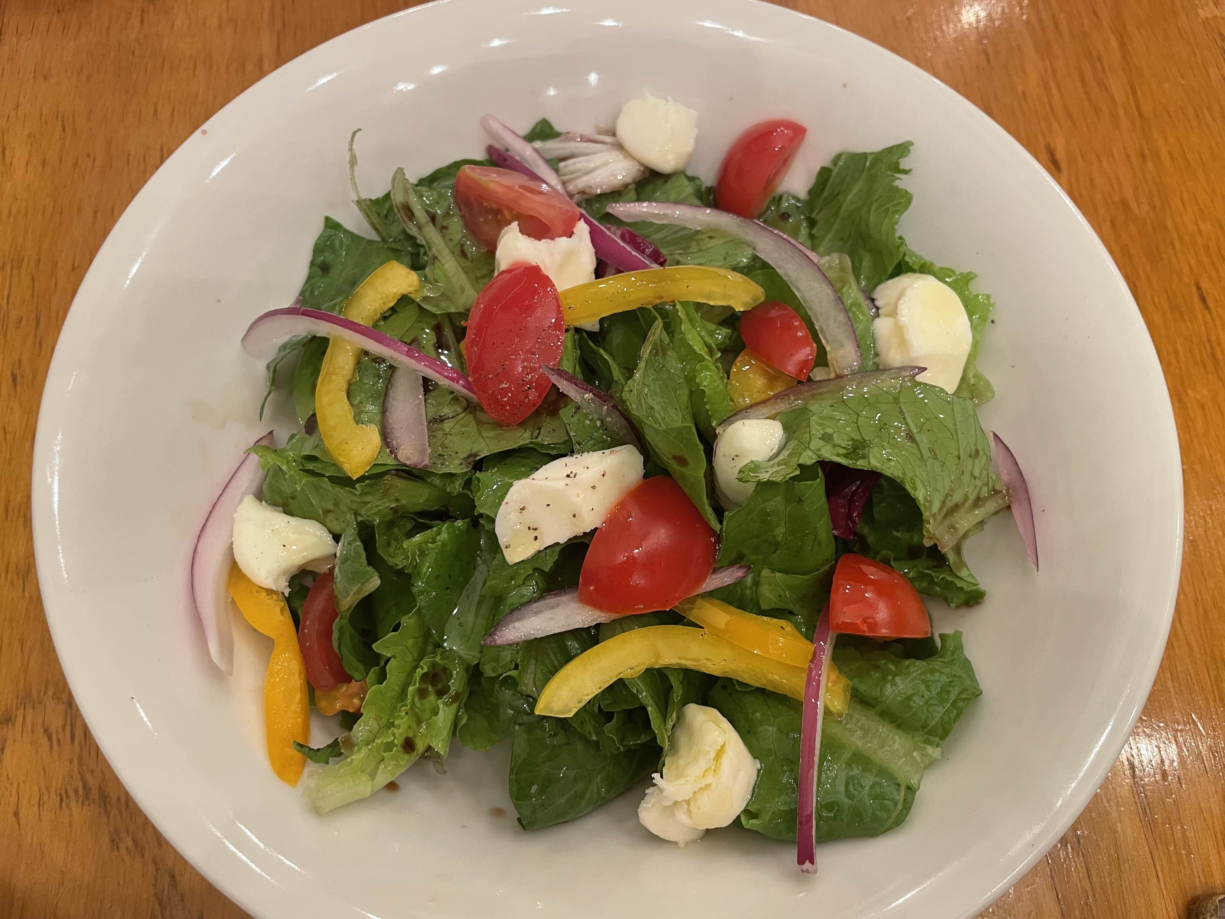 음료와 샐러드가 먼저 나왔다. 완전 집에서 해 먹는 것 같은 발사믹 드레싱의 신선한 샐러드다. 치즈도 꽤나 들어 있어서 이게 3천원짜리 샐러드 맞나 싶다. 똑같이 해먹고 싶을 만큼 매력적.