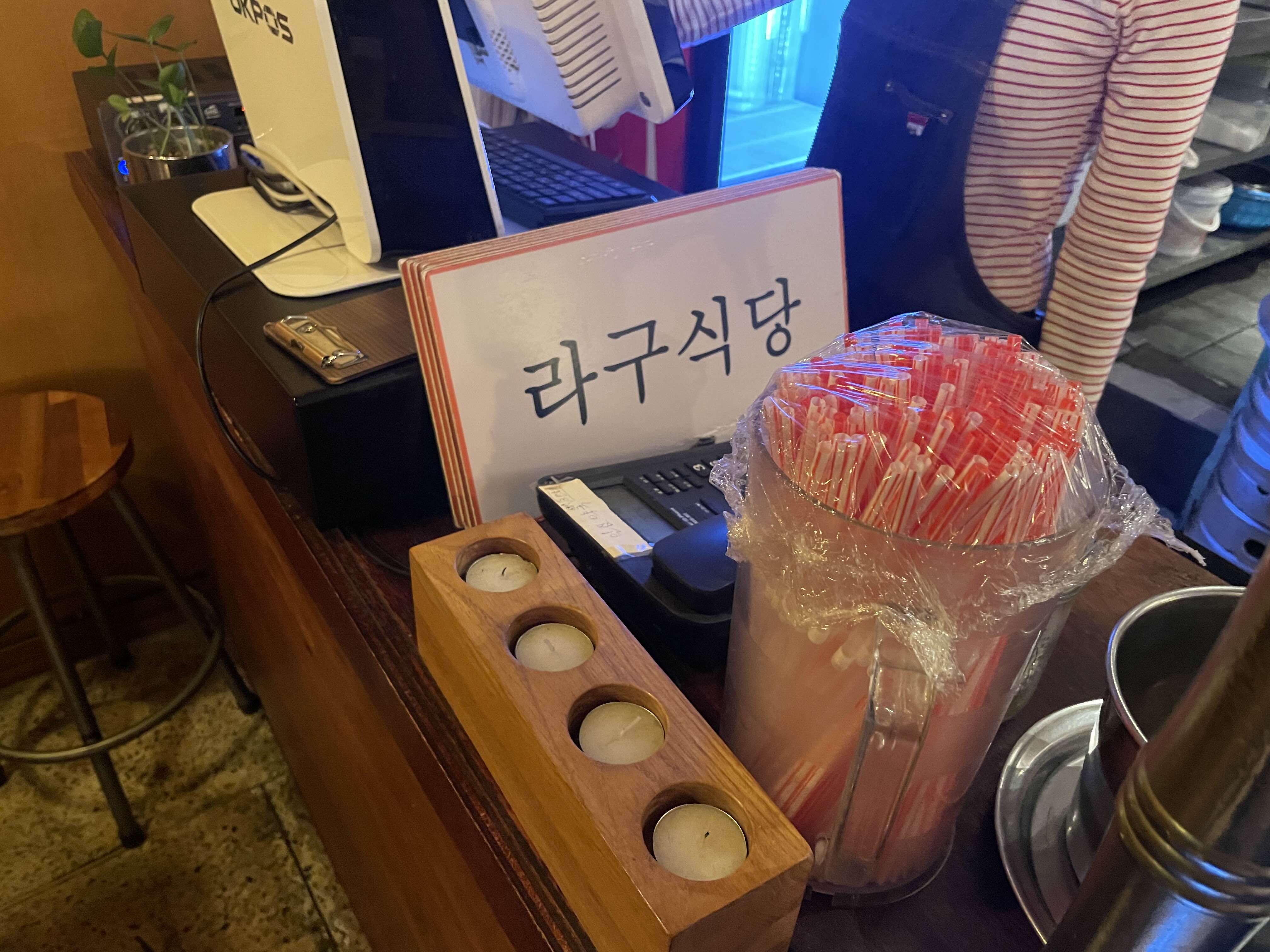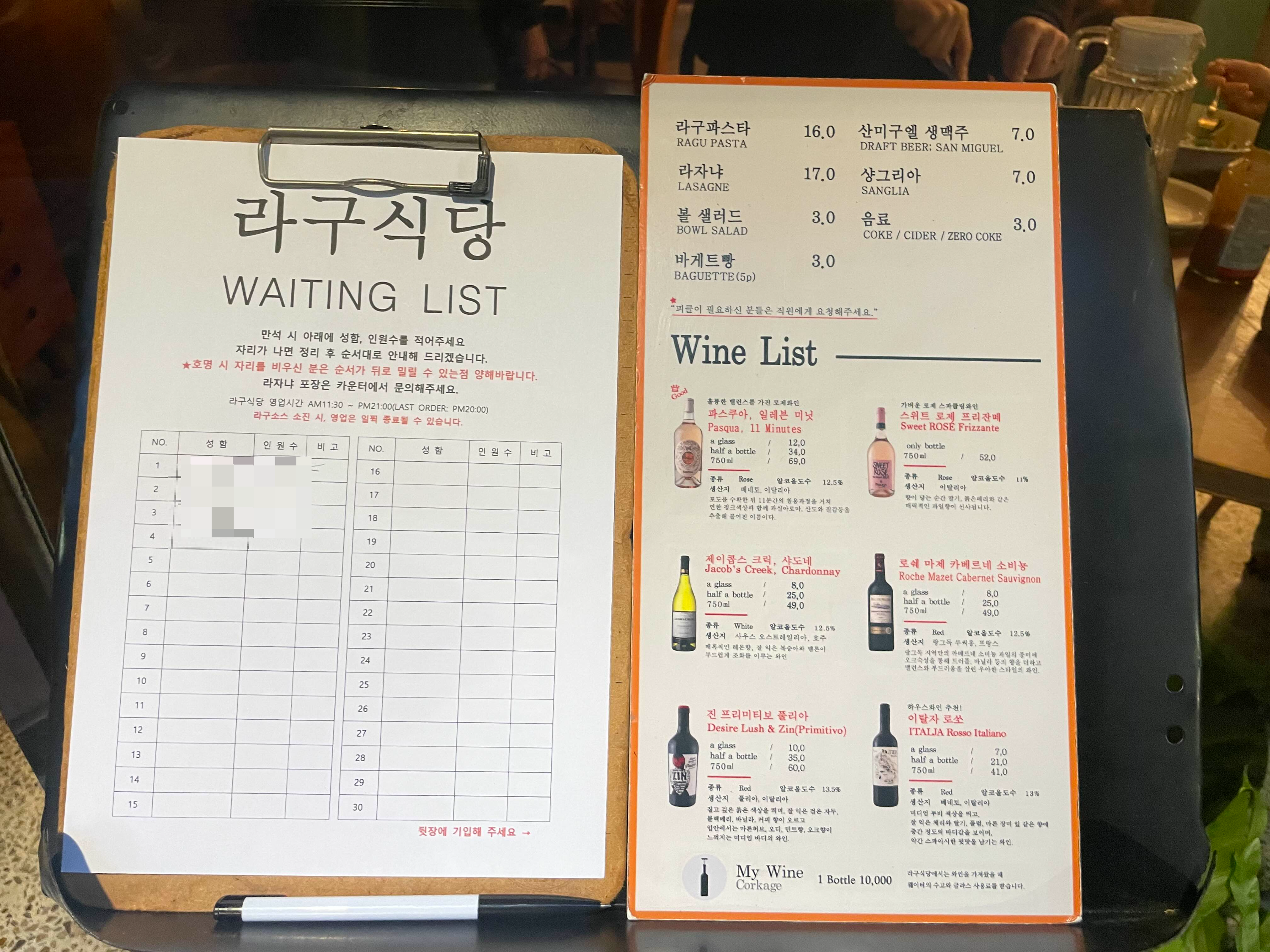 간판이 작게 있어서 첨에 라구식당인지 몰랐음. 여기는 뒷문인건지 검색해서 보았던 라구식당이라고 크게 써있는 간판은 보지 못했다. 오후 6시 전에 방문해서 그랬는지 웨이팅은 하지 않아도 되었고, 2~3테이블 정도 비어 있어서 바로 착석할 수 있었다. 그래도 토요일 저녁이라 그런지 사람은 꽤 많이 있었던 편.