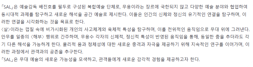 스테이지 파이터 출연진 최호종, 김효준, 윤혁중 무용 단체 SAL 기획 공연 'BETA' 서강대 메리홀 대극장 2024년 11월 9일 저녁 8시 관람 후기