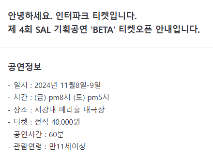 특히나 좀 더 관심이 갔던 스테이지파이터 출연진인 최호종, 김효준, 윤혁중 등이 참여하는 예술 단체 SAL이 서강대 메리홀 대극장에서 'BETA'라는 공연을 한다는 소식을 듣고 바로 예매를 했다.