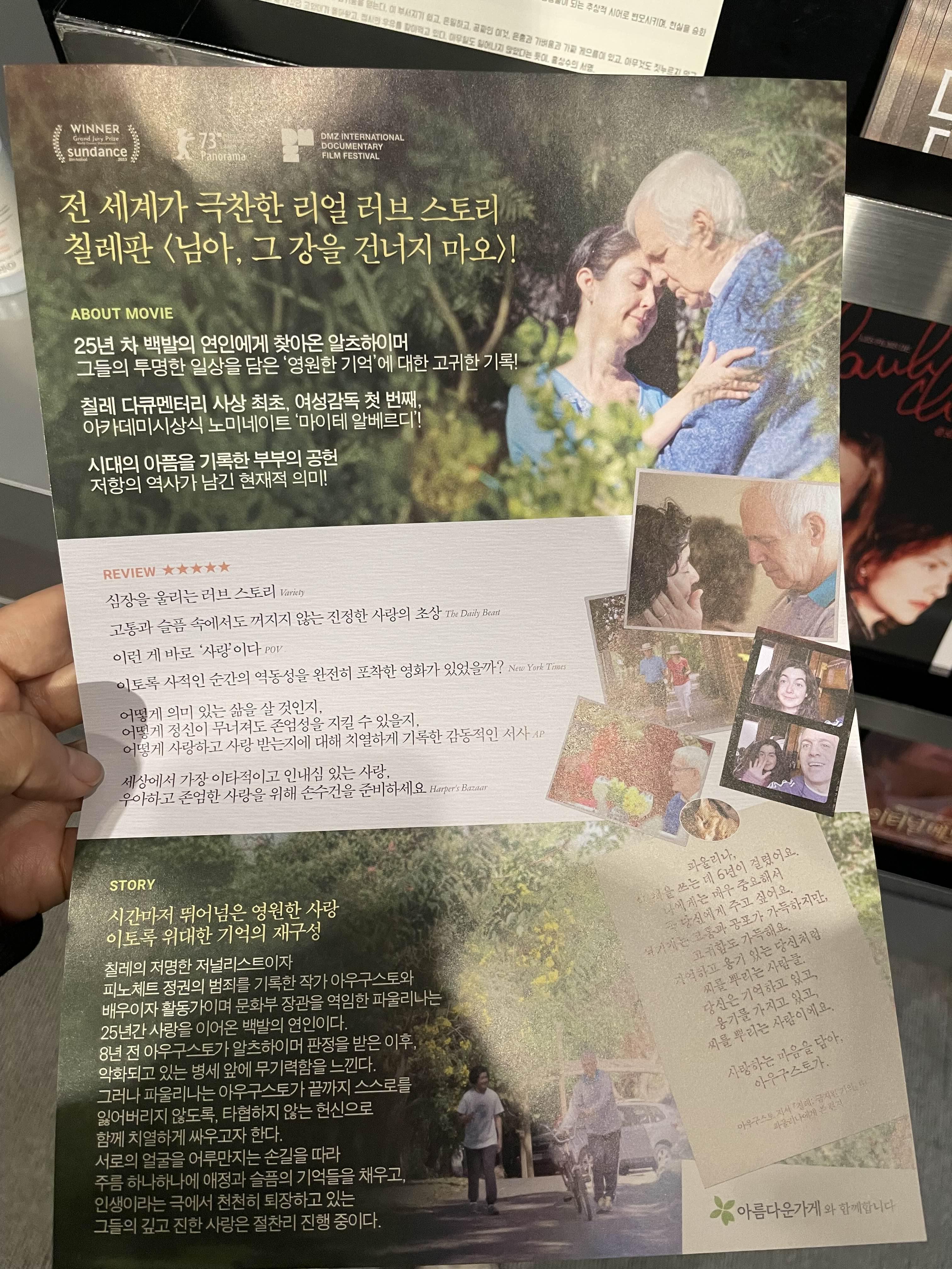 잠을 못 자고 가서 그런지, 잔잔한 영화 떄문에 그런건지 중간중간 졸았.. 다큐멘터리 형식의 영화인데 자연의 초록초록한 영상미가 아름다웠다. 서로를 향한 사랑이 잔뜩 묻어나는 영화. 보면서 계속 주인공 할아버지 귀엽고 잘생기셨네 이 생각만 한 듯하다 ㅎㅎ 돌보는 사람이 견디기 힘든 병이 알츠하이머라지만 본인이 제일 괴롭겠다는 생각이 들기도 한다.