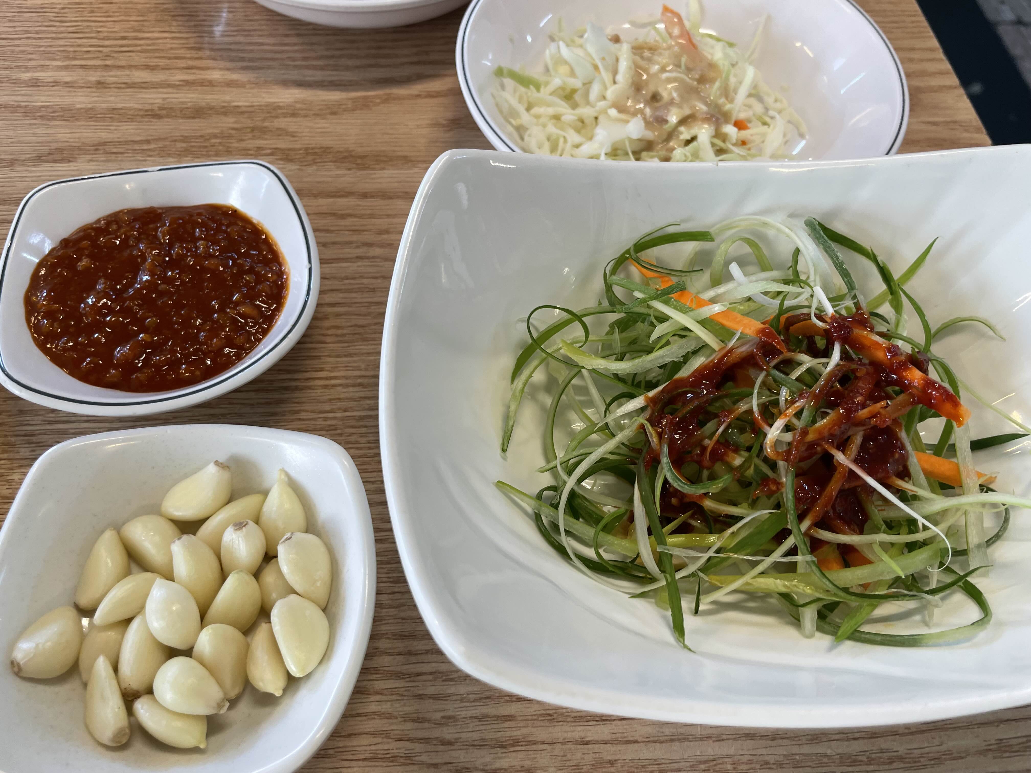 토종한우정육식당에서 제공되는 기본적인 상차림. 상차림비는 따로 없다. 고기와 함께 즐길 수 있는 쌈채소와 양파절임, 소금과 쌈장이 잘 준비되어 있어 고기를 더욱 맛있게 즐길 수 있다. 그리고 파채, 명이나물, 동치미, 샐러드 등 다양한 반찬이 제공되는데, 이 모든 반찬이 고기의 느끼함을 잡아주고, 입맛을 돋군다. 또한 밥까지 쫀득쫀득하니 맛있다. 이곳은 반찬 하나하나가 고기와 완벽하게 조화를 이루어, 만족스러운 한 끼를 만들 수 있도록 도와주는 듯하다.