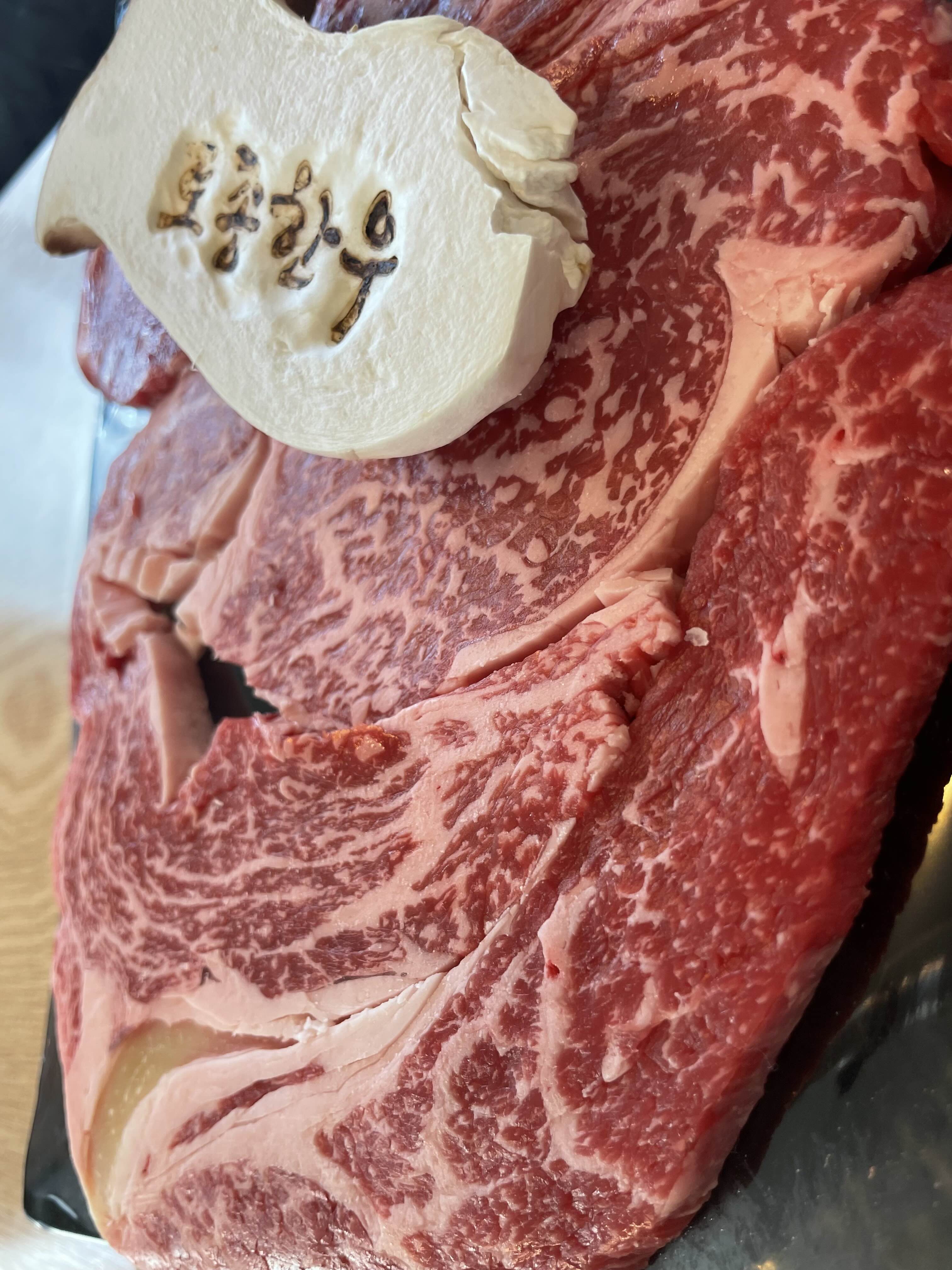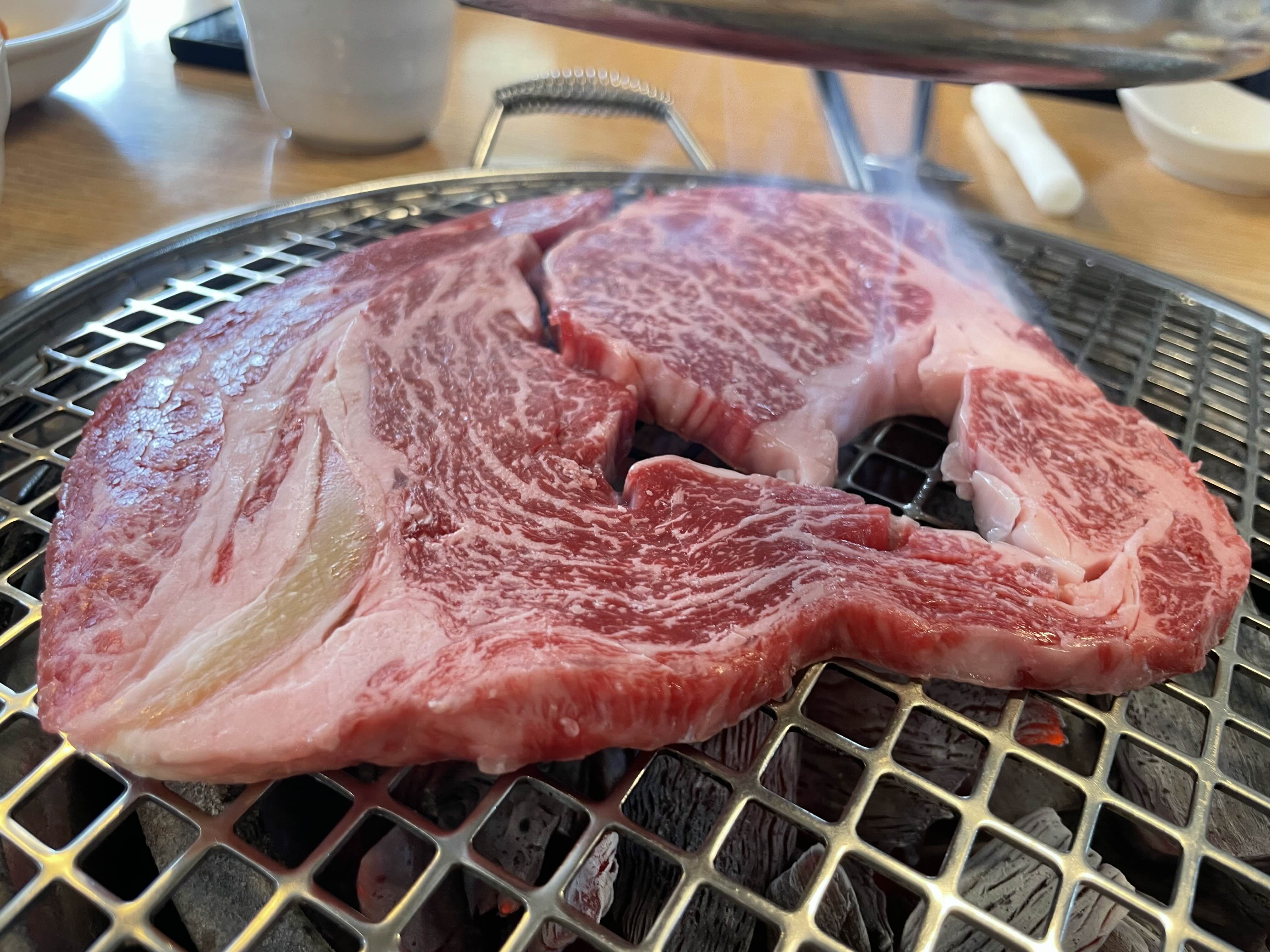 토종한우 정육식당의 한우꽃등심. 이곳의 고기는 정말 특별하다. 한 눈에 보기에도 고기 질이 좋아보이고 신선함이 남다르다. 새송이버섯과 함께 나오는데 이 버섯 또한 구우면 고기 같은 풍미가 나서 신기하다.