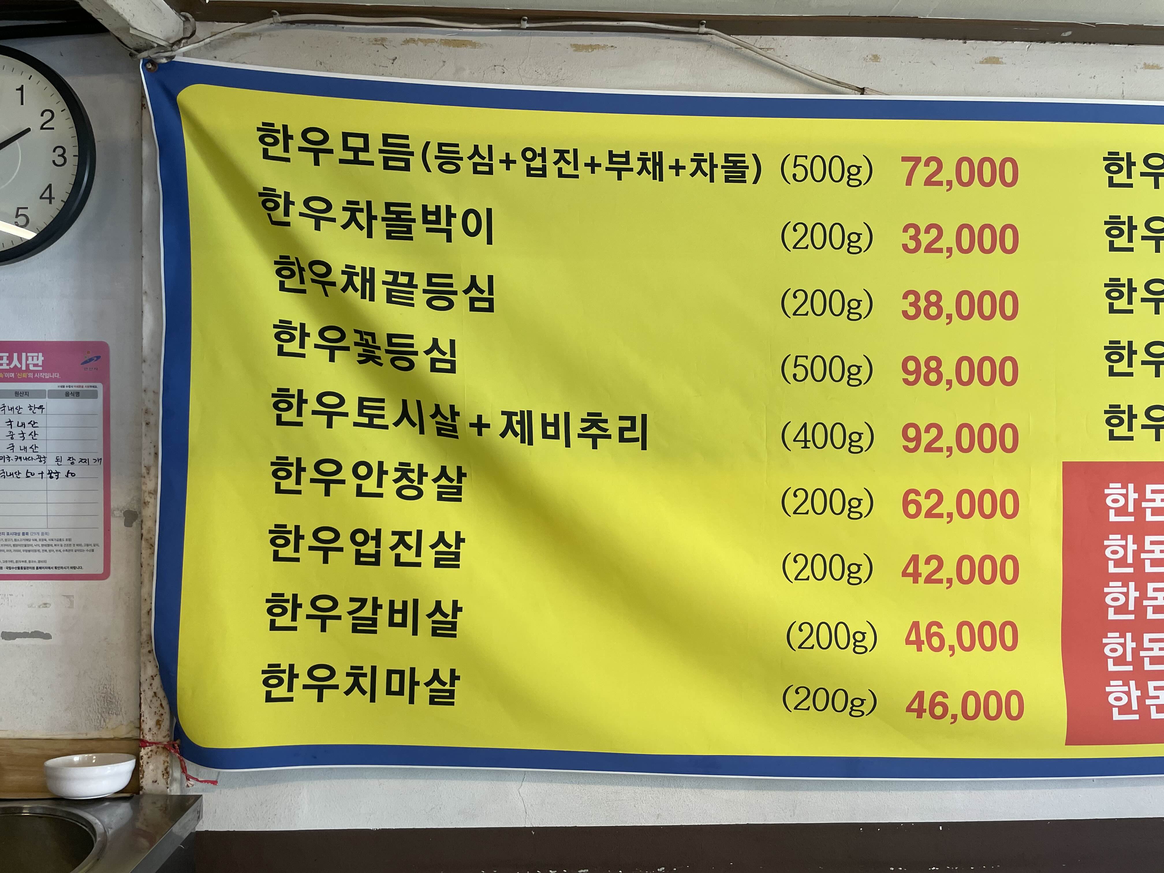 안산 토종한우정육식당의 메뉴들. 이곳은 고급 한우를 제공하면서도 가격이 너무 비싸지 않아서 비교적 부담 없이 한우 구이를 즐길 수 있는 곳이다. 특히 꽃등심 같은 인기 부위도 다른 고기집에 비해 가격이 무난한 편이라, 가성비를 중요시하는 분들에게도 추천할 만한 고깃집이다.