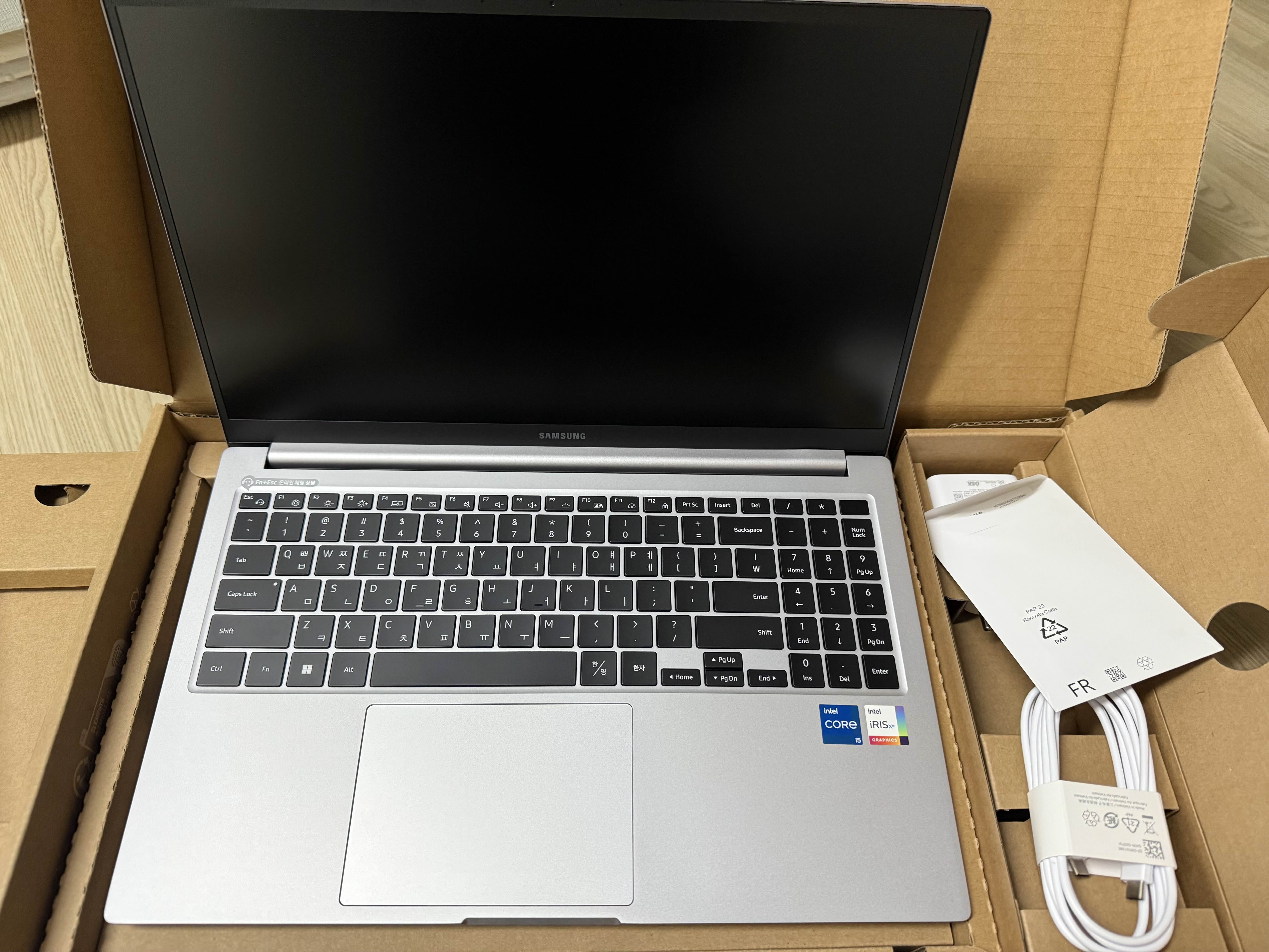 삼성노트북 패키지 박스가 생각보다 컸는데, 구성품으로는 노트북 본품과 C타입 케이블, 45W어댑터, 사용설명서가 들어있다.