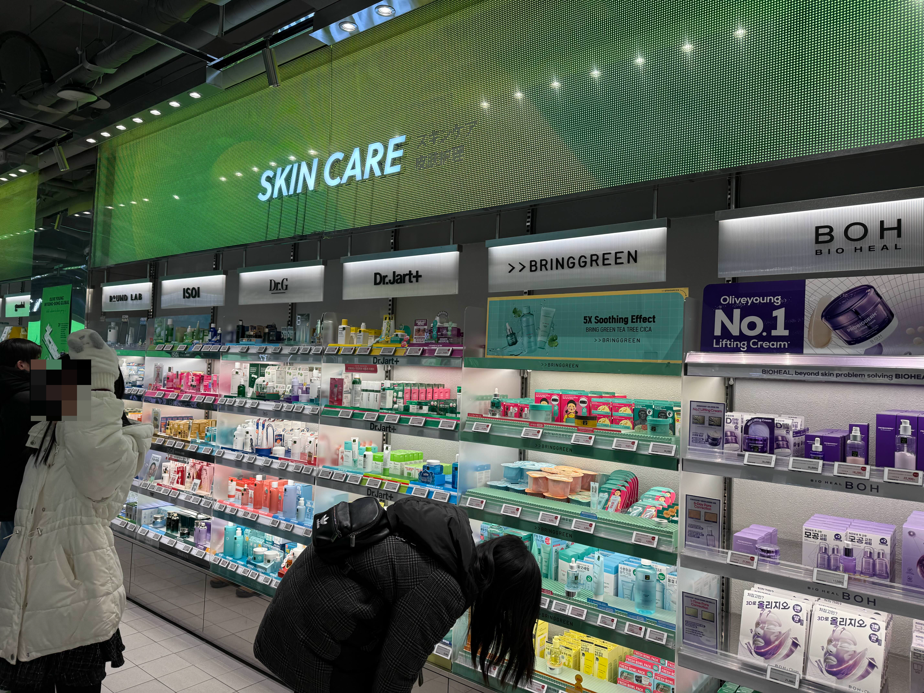 올리브영 명동타운점 1층은 주로 기초화장품 위주의 상품이 진열되어 있었다. 그 많은 화장품들이 피부 고민이나 관심사별로 진열되어 있어서 규모나 구성면에서 외국인들의 화장품 쇼핑 성지가 될 만하다. 그리고 무엇보다 깔끔한 매장 분위기도 한 몫을 하고 있다.