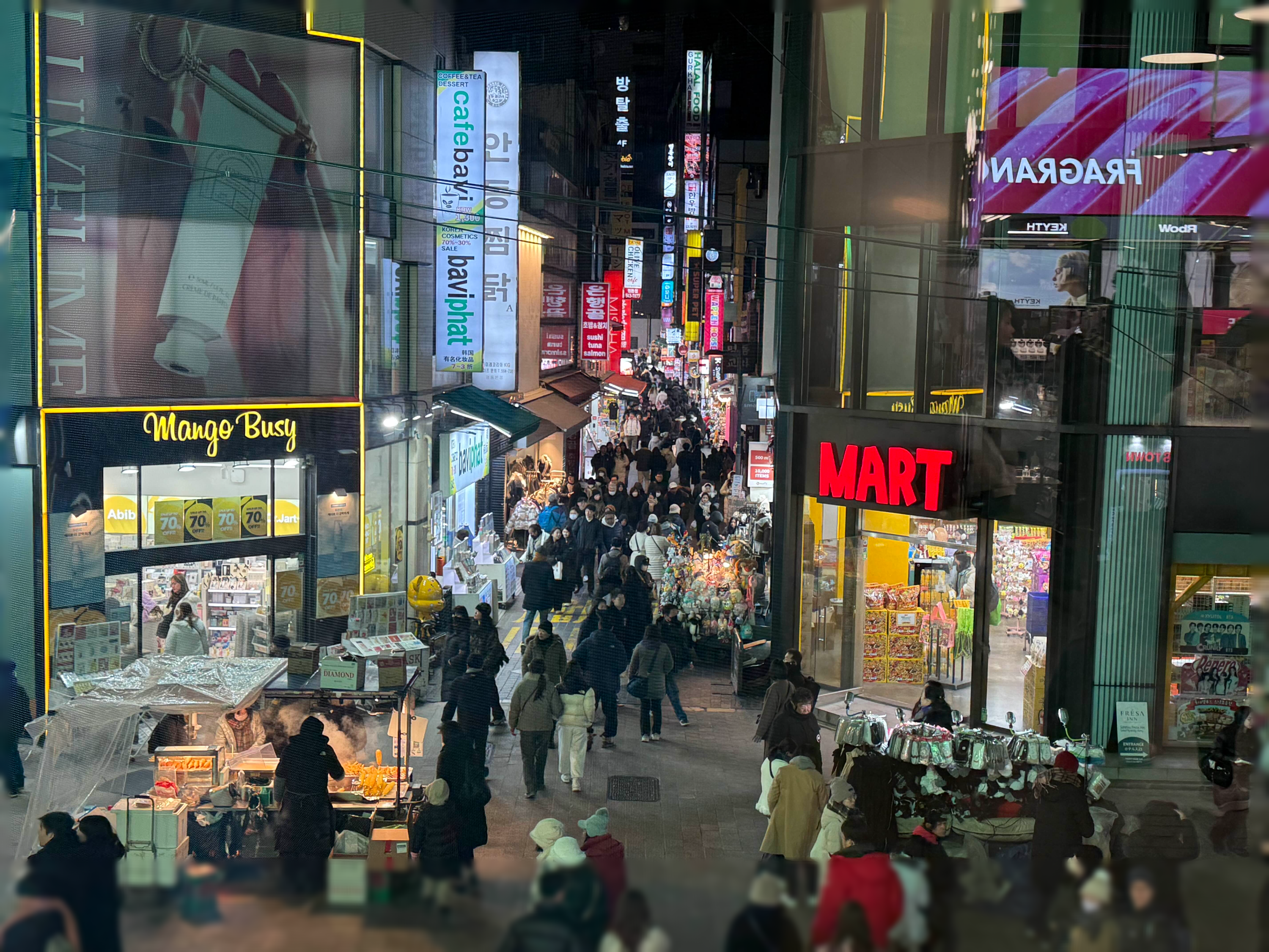 올리브영 명동타운점 2층 통유리창에서 바라본 명동 거리. 주말이라 그런지 사람들로 북적북적하다.