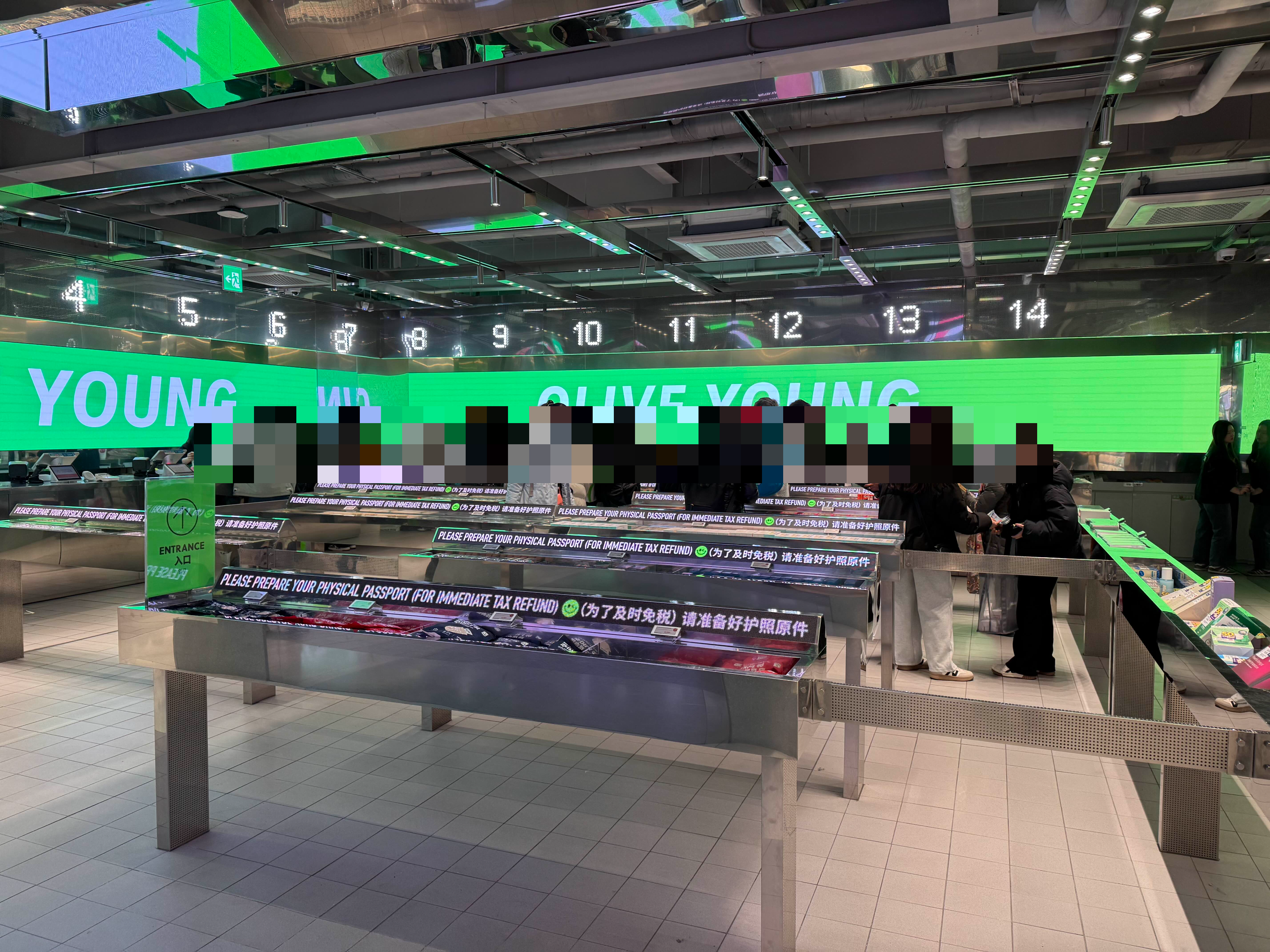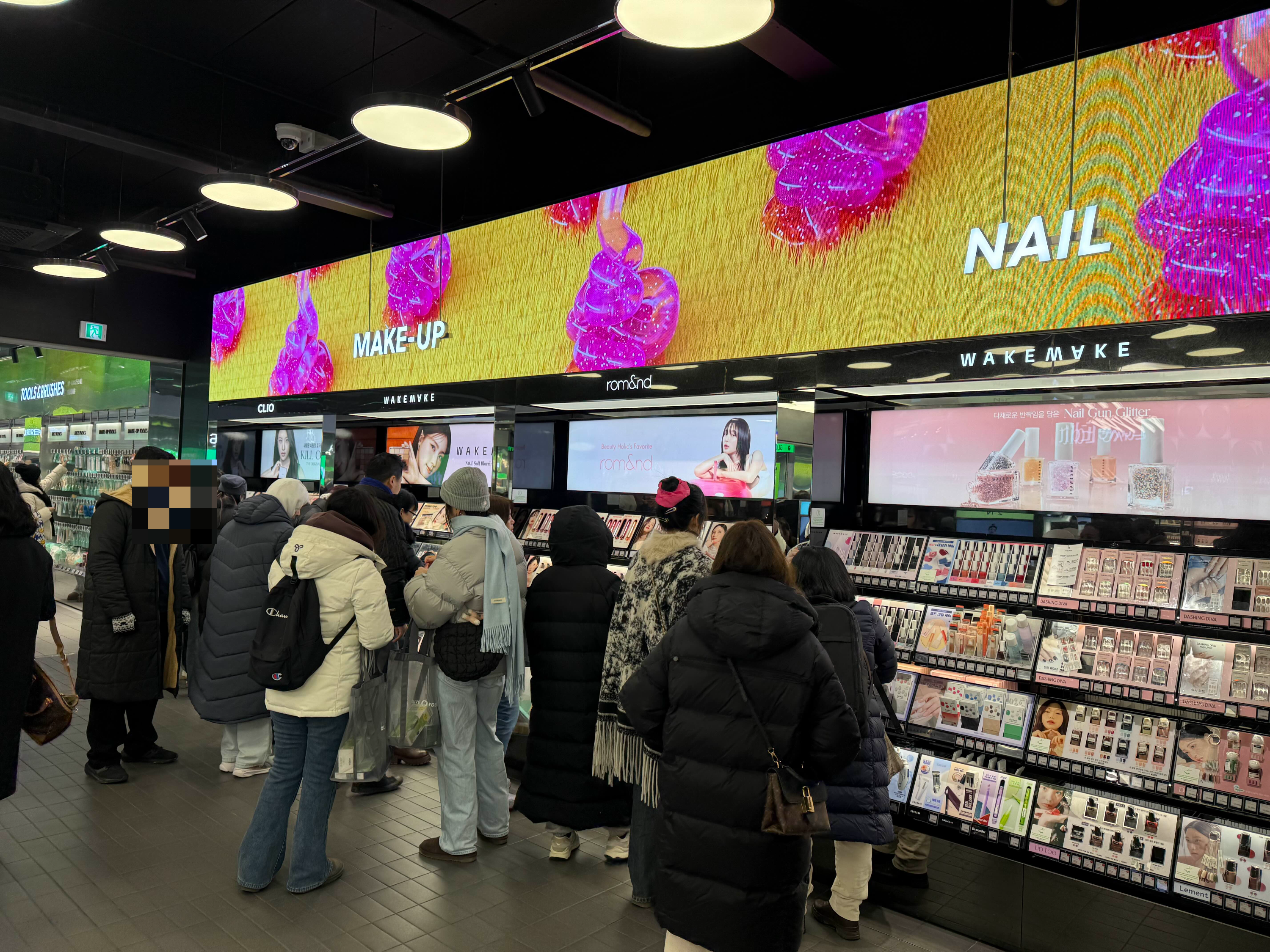 명동 한복판에서 드디어 마주하게된 올리브영 명동타운점은 정말 그 어떤 지점보다도 큰 매장이었다. 매장은 2층 규모로 이루어져 있는데, 들어가는 입구부터 사람들로 북적북적하다. 그 많은 사람들은 90%이상이 외국인 방문객으로 보였다.
