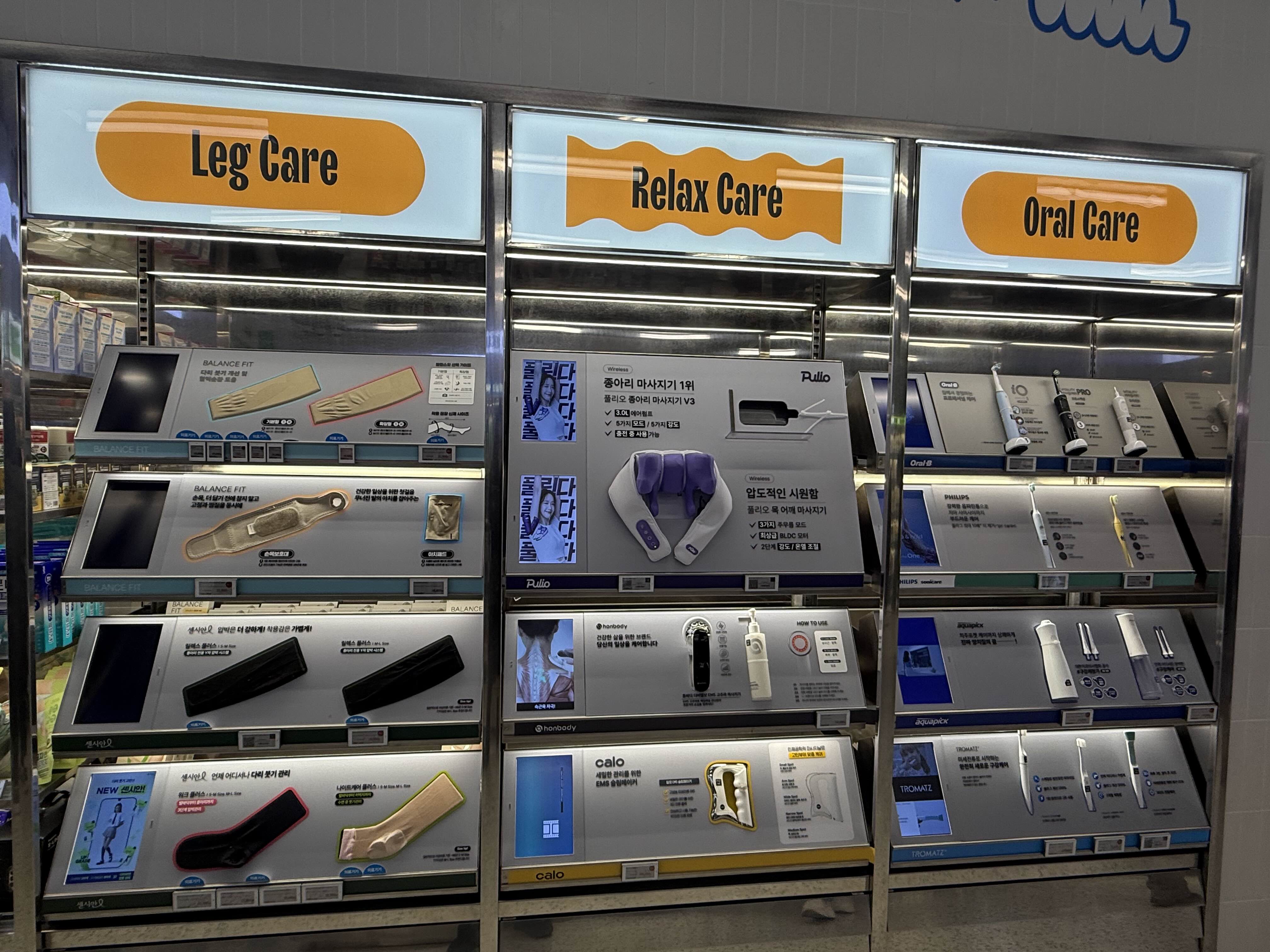 이너 뷰티. 아이케어, 풋케어, 여성제품 등등 세분화되어서 상품이 진열되어 있고, 정말 다양한 제품이 있어서 뭘 사야 될지 고민이 될 것도 같다.