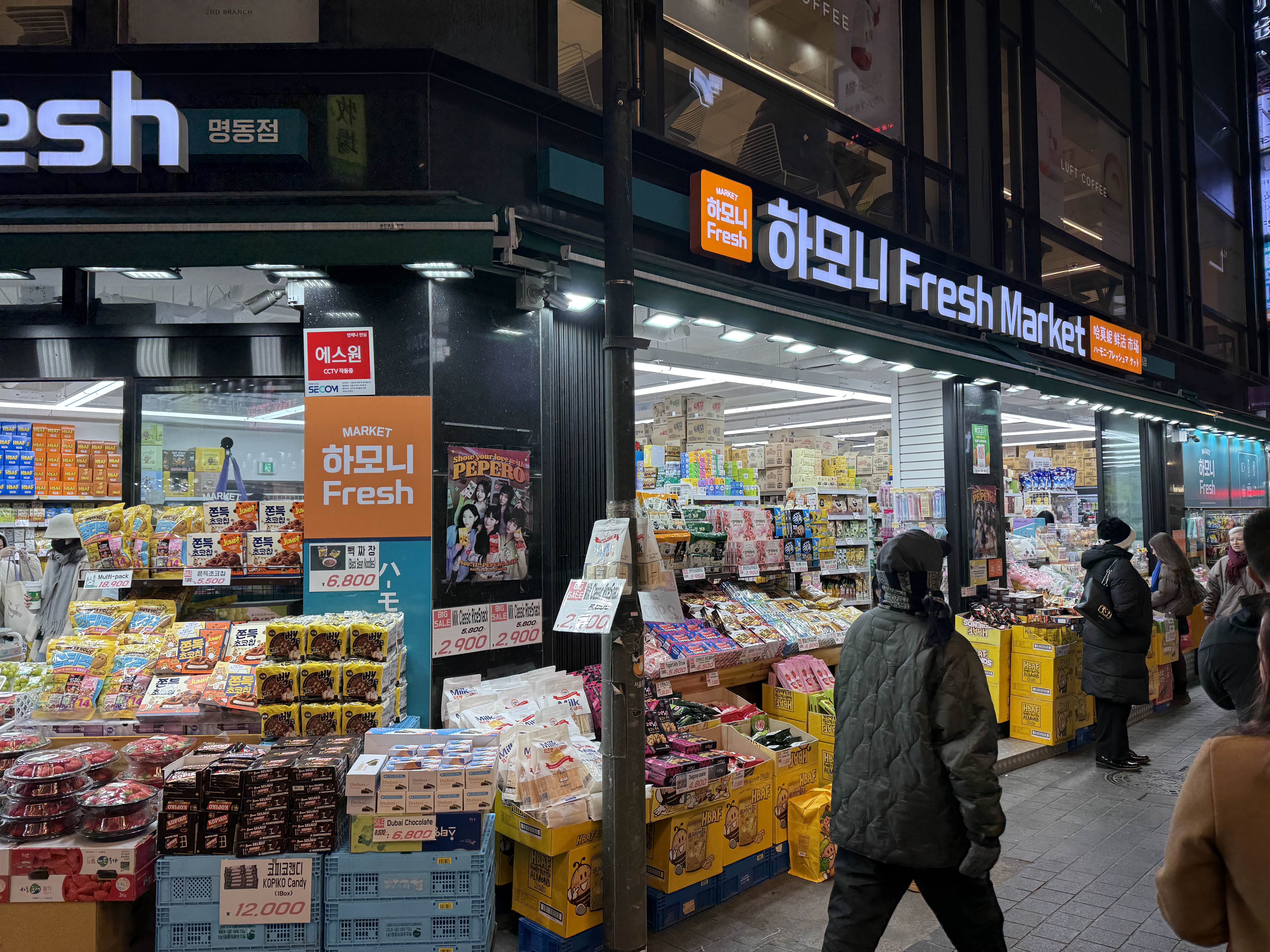 요런식으로 명동 거리 골목마다 마트들이 늘어서있어서 신기했다. 캐릭터용품들도 많고 우리나라 과일이 맛있어서 외국인들에게 인기인지 샤인머스켓과 딸기, 감말랭이까지 있다. 우리나라보다도 외국인들에게 더 인기있는 것 같은 아이러니한 상황 ㅎㅎ